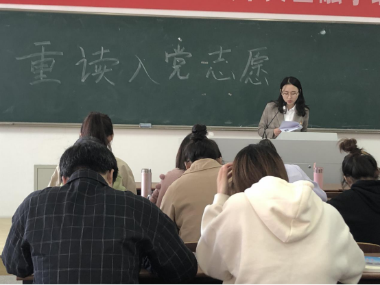 “我要把最好的青春年华献给党!”吴海珍同学重读了她的入党志愿,在入党志愿中回忆入党的初心。吴海珍在学习中勤勤恳恳,积极参与各类学科竞赛与社会活动,作为一名党员她身体力行,用行动讲述了一位学生党员服务社会奉献人民的初心。班长刘逸菲同学重读了她的入党志愿书,分享了入党动机,讲述了个人成长经历。她将理论化为实践,躬行实践一名共产党人的奉献服务精神,在节假日服务家乡,与家乡共成长!退伍士兵郑佳重读了他的入党志愿,并表示,当兵时愿意随时为党和人民牺牲自己的生命,现在亦然!