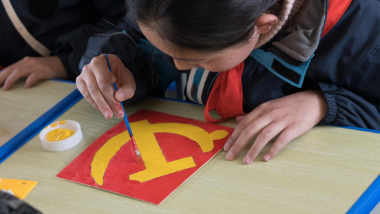 在向阳路小学,学生党员带领少先队员们开展了党徽绘画活动,同时结合党的百年光辉历程和伟大成就开展宣讲,用青言青语在少先队员们心中播撒“强国复兴有我”的种子。