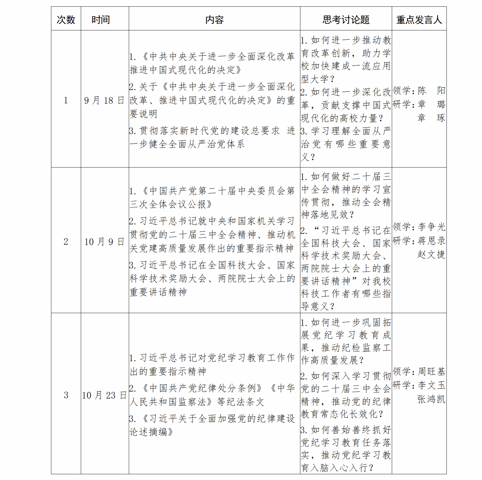 9.各党支部制订具体学习计划(含学习时间、学习地点、学习内容、领学人、重点发言人等,党支部书记主持和总结点评),以电子版形式报送院党委组织员朱碧玲老师留存备案。