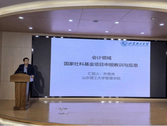 在主题报告环节,乔贵涛教授作了题为《会计领域国家社科基金项目申报教训与反思》的报告。围绕申报教训和申报反思两个角度,从选题、选题说明、选题依据、研究内容、创新之处、研究基础、参考文献、组织工作等方面分享了国家社科基金申报的心得体会。