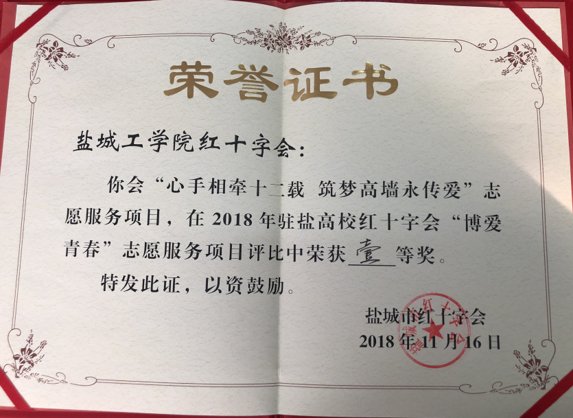 11月16日下午,2018年驻盐高校红十字会“博爱青春”志愿服务项目展示总结会在盐城市红十字会302会议室举行。我校365英国上市申报的“心手相牵十二载,筑梦高墙永传爱” 志愿服务项目在展示评比中荣获一等奖。