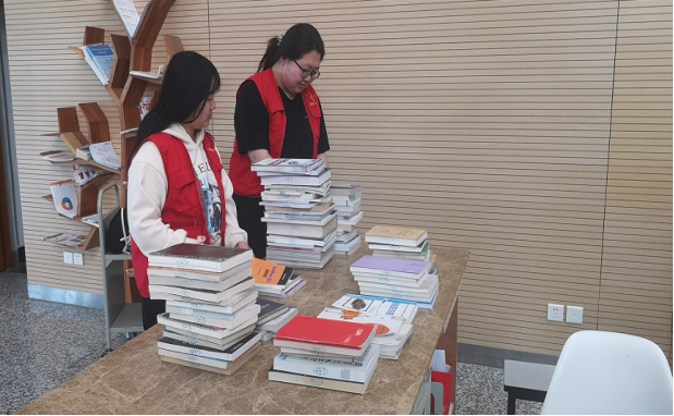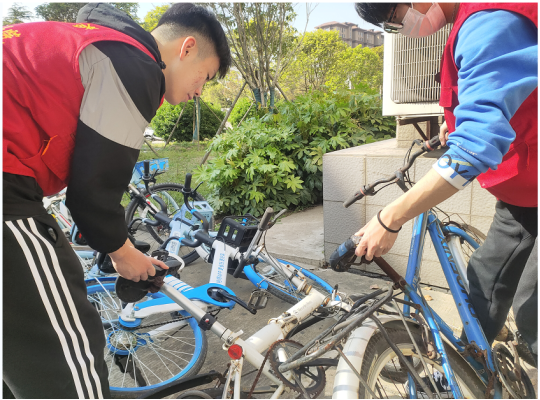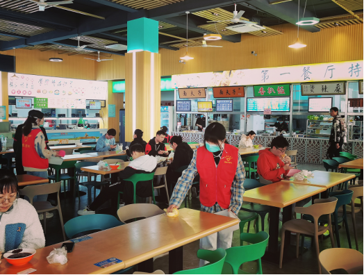 在校园的各个角落,都能看到志愿者们辛勤服务的身影。五四报告厅里,数位志愿者相互合作,打扫卫生,有条不紊地进行工作,为报告厅带来清洁。非机动停车位区域中,志愿者们耐心地搬排共享单车,遇到损坏无法推动的车子,也毫无怨言,费力地将其搬运到应在的位置,他们良好的精神风貌为清冷的早晨增添了一份温暖。图书馆入口处,两位志愿者正细心地将图书进行分类整理摆放,并不停地核实进入馆内人员是否刷卡,分担了图书馆工作人员的负担。食堂收餐处,志愿者帮助食堂阿姨排放餐具,将残羹倒入垃圾桶,为同学们营造良好的就餐环境。