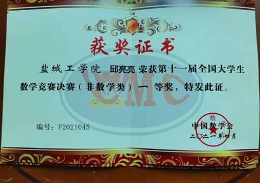 在第十一届全国大学生数学竞赛中,我院邱亮亮同学从参赛高校849所、报名总人数达170784人的层层选拔中一路过关斩将、脱颖而出,最终在4月18日武汉大学进行的决赛中蟾宫折桂,荣获非数学专业组决赛一等奖。为我校在本届赛事中获非数学专业类一等奖总数全国高校第三、江苏第一作出了突出贡献。邱亮亮同学己连续三届获得该项竞赛一等奖,并以优异成绩考取了南京师范大学数学专业研究生。我院近年来在全国、省组织的高校各类学科竞赛中频频获奖,展示出教学教研和管理百舸争流、百花齐放、蓬勃发展的喜人局面。