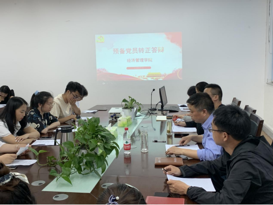 6月3日晚,经管学院在南校区仁和楼B202会议室召开预备党员转正答辩会。学院党委副书记周旺基,学生第三党支部书记陈广正,学生第一党支部书记张成联和学生第二党支部书记邱天星担任评委,29名预备党员同志参加。