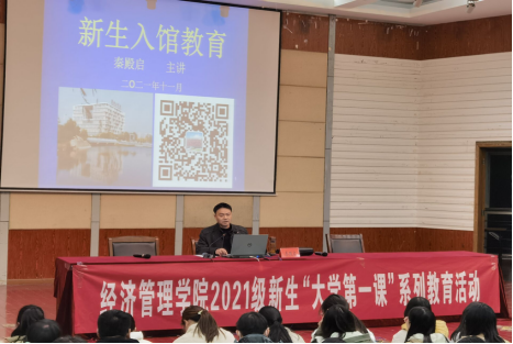 为进一步提高新生自主学习能力,11月22日-23日,经管学院邀请图书馆秦殿启主任开展三场新生入馆教育培训讲座。学工办副主任高加友主持,新生辅导员范宏伟、杨阳、肖舒语出席,600余名2021级学生参加学习。