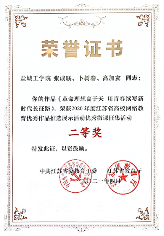 近日,江苏省委教育工委、省教育厅公布“2020年度江苏省大学生网络文化节和高校网络教育优秀作品推选展示活动遴选结果”,经管学院党委书记卜树春主讲,张成联、高加友制作的微课作品《革命理想高于天,用青春续写新时代长征路》荣获2020年度江苏省高校网络教育优秀作品微课类二等奖。